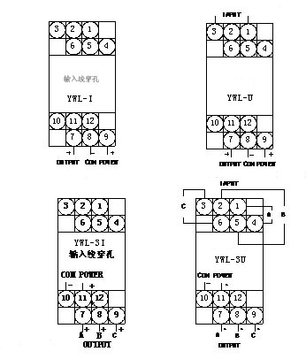 注: 1、YWF、YWL系列交流電流變送器輸入線從變送器外殼設置的穿孔穿過,不分J性。